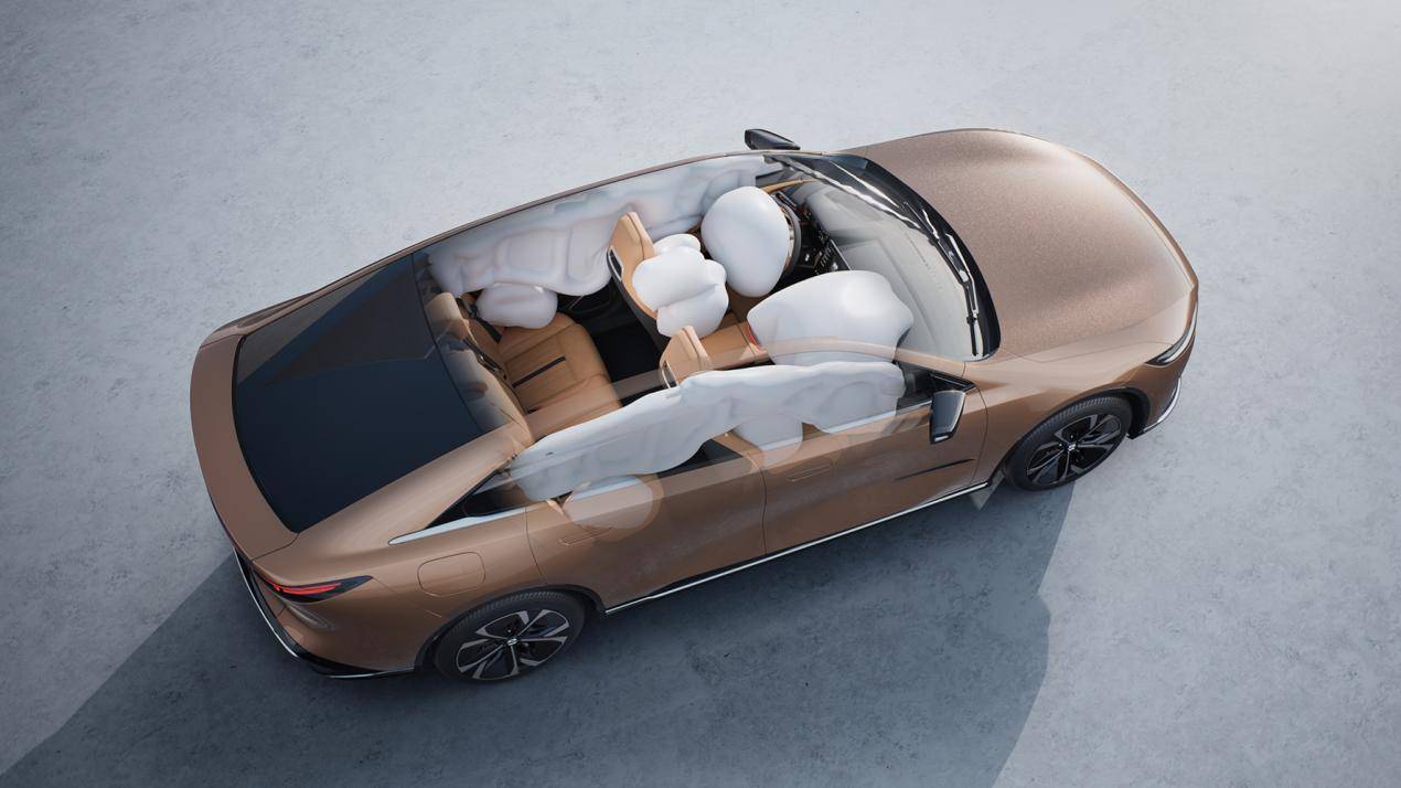 EZ-6的中歐車型都標配9個大型安全氣囊,括主副駕氣囊、前排側氣囊、側氣簾、前排遠端氣囊、后排氣囊。氣囊總容積達350L,保壓6秒,保護面積25,000平方厘米,側氣簾長度2米。
