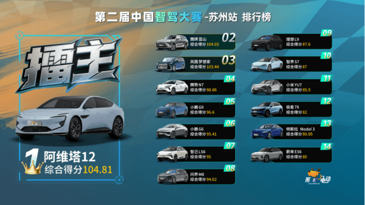 根據(jù)裁判組消息,獲得第二屆智駕大賽蘇州站城市NOA賽前三名的是——冠軍,阿維塔12!亞軍,魏牌藍山!季軍,嵐圖夢想家!