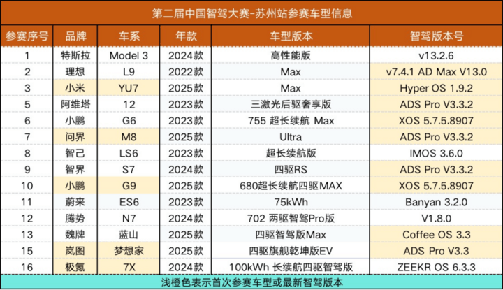 本站比賽共有來自13個品牌的14輛車型參賽,創(chuàng)比賽以來參賽車輛最多紀錄,這14輛車型分別是:特斯拉Model 3、理想L9、小米YU7、阿維塔12、小鵬G6、問界M8、智己LS6、智界S7、小鵬G9、蔚來ES6、騰勢N7、藍山、嵐圖夢想家、極氪7X。其中,有5輛車型為首次參賽,以小米YU7為代表,同時還有9輛中型升級了最新的智駕版本。