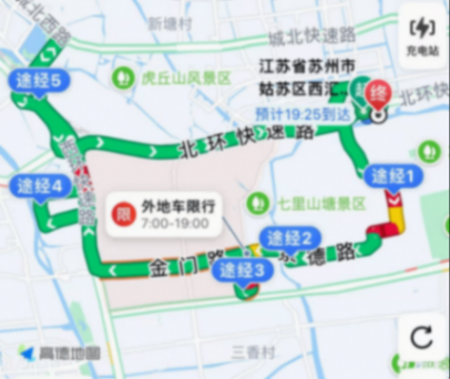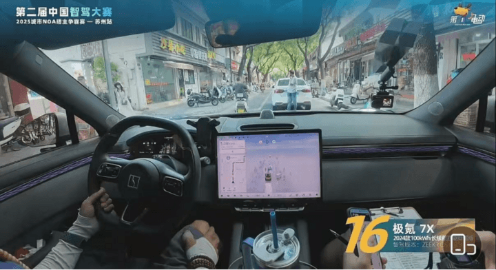 蘇州站的比賽路線難度非常大,考點賽前全部隱藏,全程22公里,經(jīng)過38個紅綠燈,5個途經(jīng)點,6個考點,在社區(qū)窄路、潮汐車道、商圈窄路+感應道閘、人造限寬墩、掉頭、環(huán)島等交通場景,對參賽車輛的城市NOA智駕能力進行考驗。