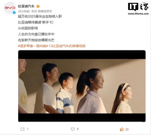 7 月 21 日消息,今日,比亞迪官方宣布今日起超萬名 2025 屆畢業(yè)生陸續(xù)入職。