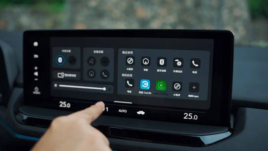 座艙內(nèi)的設(shè)計(jì)相較當(dāng)前主流的新勢(shì)力品牌要沉穩(wěn)務(wù)實(shí)許多,貫穿式的空調(diào)出風(fēng)口嵌入了金屬質(zhì)感的鏤空格柵設(shè)計(jì),將臺(tái)面也劃分為上下兩層區(qū)域,并包覆了相對(duì)軟性的材料,10.2英寸的全液晶儀表與12.3英寸的中控屏在尺寸上雖然并不占優(yōu),但同樣勝在實(shí)用性,車機(jī)內(nèi)部配有CONNECT 4.0系統(tǒng),在應(yīng)用功能上足夠滿足日常駕駛所需。主駕位還配有語(yǔ)音助手,可進(jìn)行簡(jiǎn)單的指令控制,不過(guò)不支持可見(jiàn)即可說(shuō)功能。
