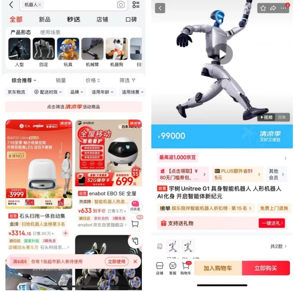 券商中國記者搜尋京東平臺發現,平臺已上架多種零售機器人,并設置了人形、四足、機械臂、玩具、機器狗以及掃地機器人等多個分類。宇樹科技也在京東平臺開設京東自營旗艦店,以其人形機器人GI為例,在該平臺的售價為99000元。