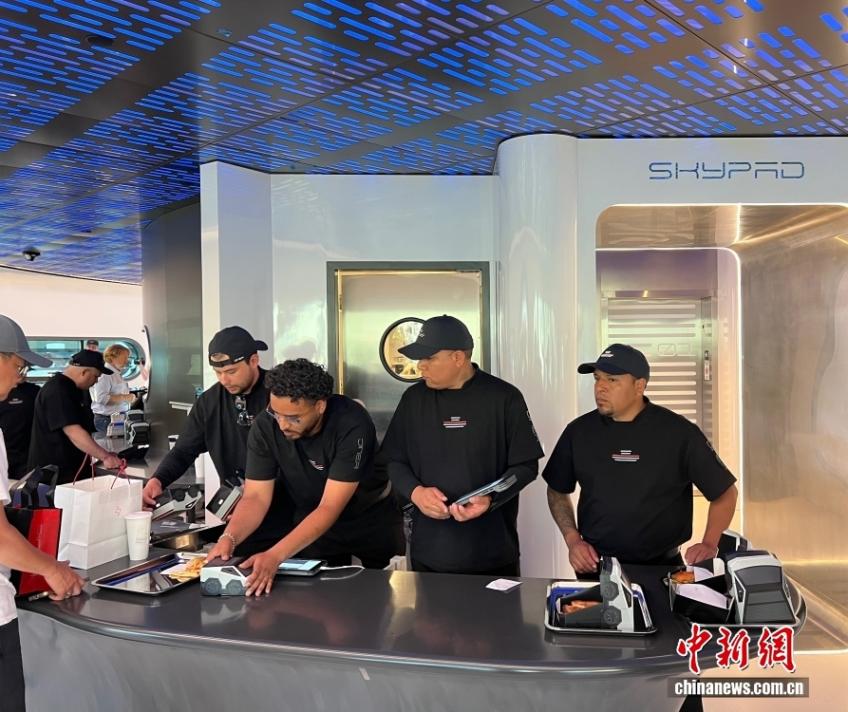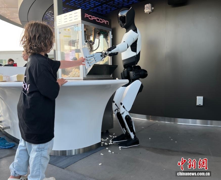 當地時間7月21日下午,美國人工智能巨頭特斯拉公司的首家超級充電站餐廳在洛杉磯正式向公眾開放,無特斯拉車輛也可訪問。圖為特斯拉首家超級充電站餐廳內,特斯拉人形機器人“Optimus”給小朋友派發爆米花。 中新社記者 張朔 攝