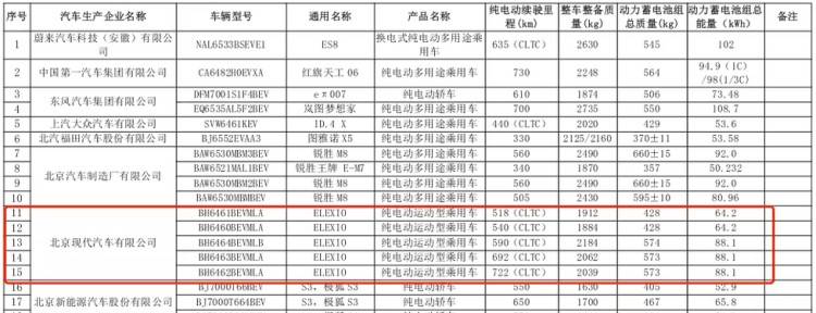 從本次目錄曝光的信息來看,北京現代ELEXIO提供了64.2/64.2/88.1/88.1/88.1kWh不同大小的電池包,對應的CLTC純電續航里程分別為518/540/590/692/722km。作為一臺純電SUV,新車采用最大功率為160千瓦的單電機驅動,將于9月份正式上市。