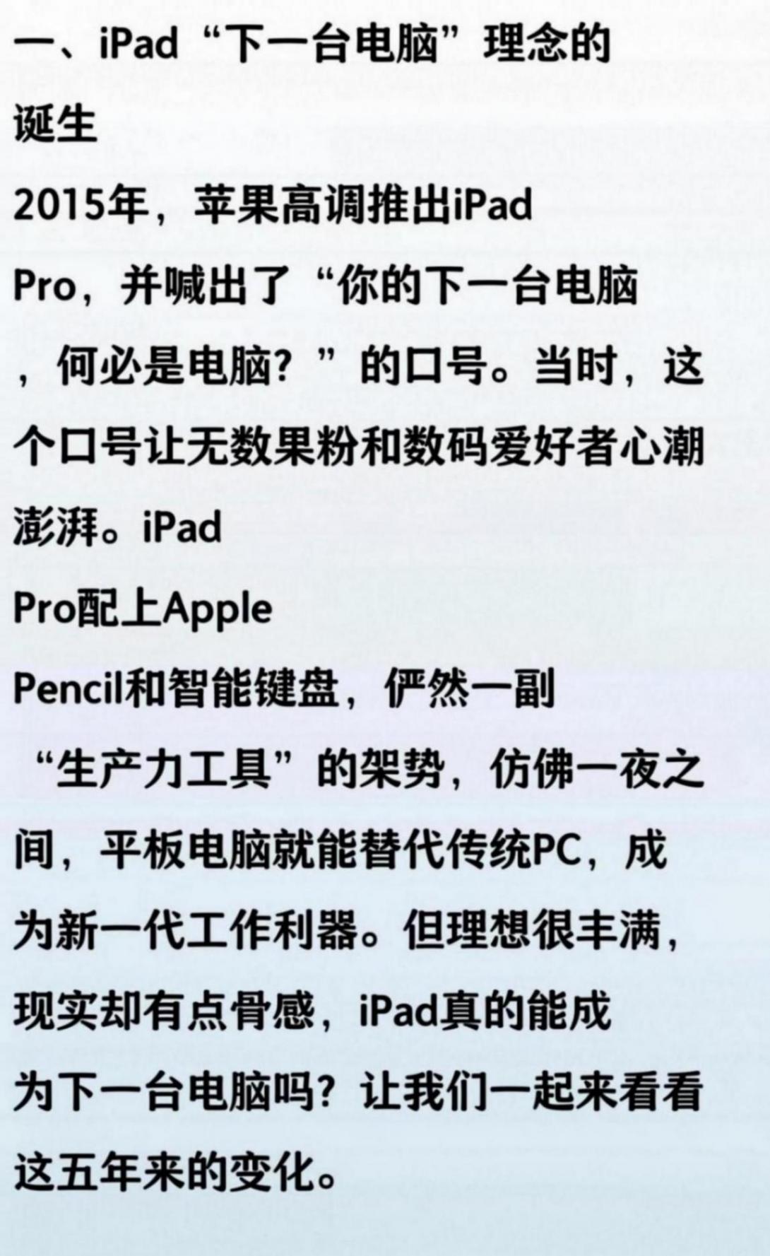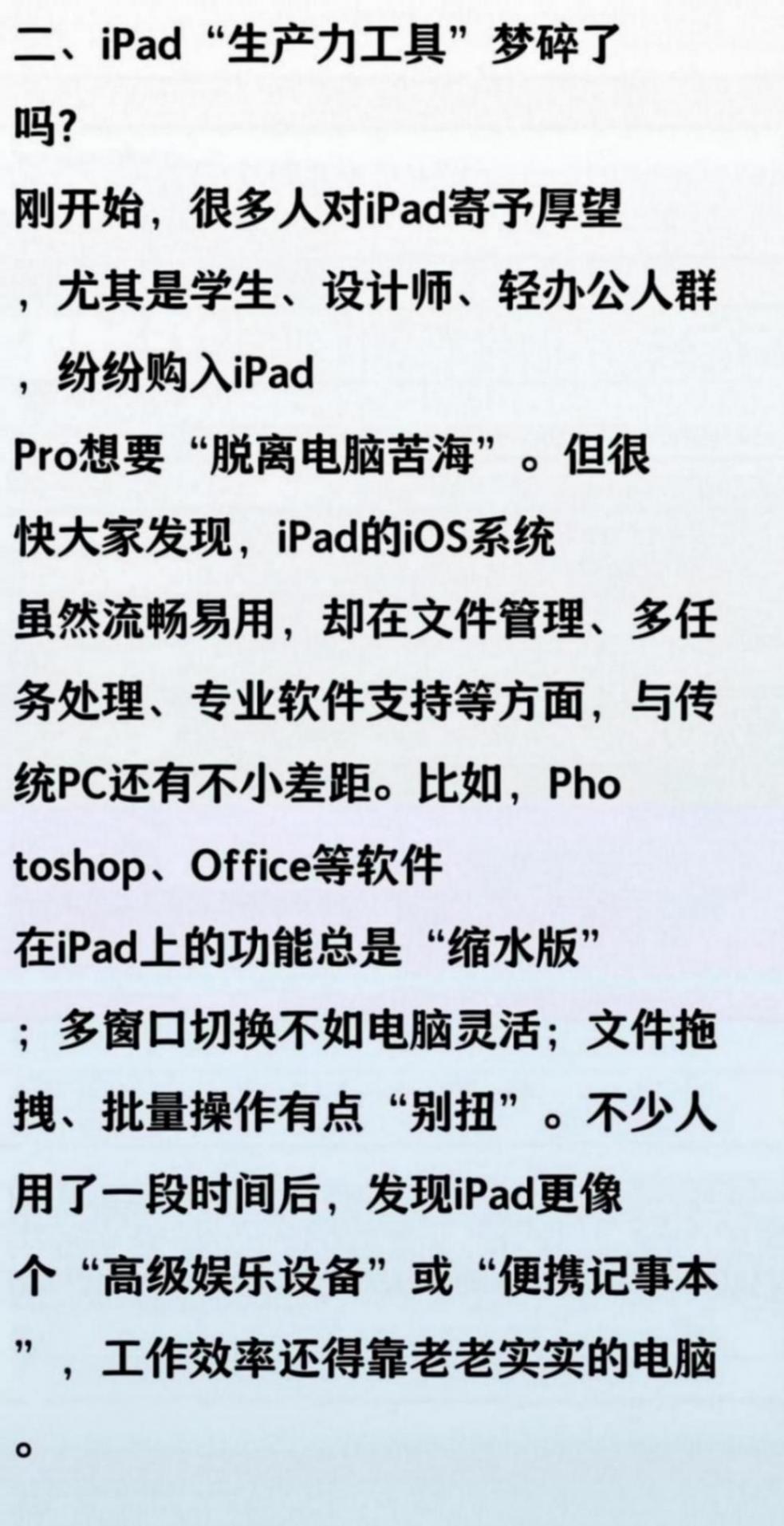 五年前,很多人信誓旦旦地說要用iPad替代電腦,結果現在還堅持的人真不多。剛開始確實新鮮,輕便、續航好,追劇畫畫很方便,但一到辦公、剪視頻、碼字,還是得乖乖回歸電腦。iPad終究沒法完全替代電腦,更多成了娛樂和學習的“第二屏”。你是不是也有同感?