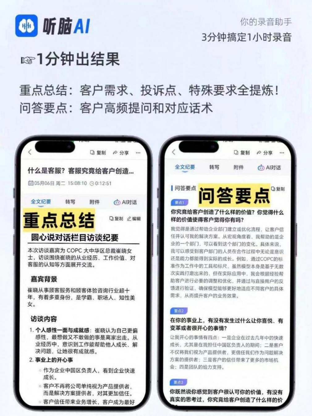 說白了,這些工具都停留在""把聲音變成文字""的階段,沒解決""文字怎么用""的問題。記錄的目的是為了用信息,不是為了存文字——這就是傳統工具最大的短板。聽腦AI體驗入口:https://h5ma.cn/npr