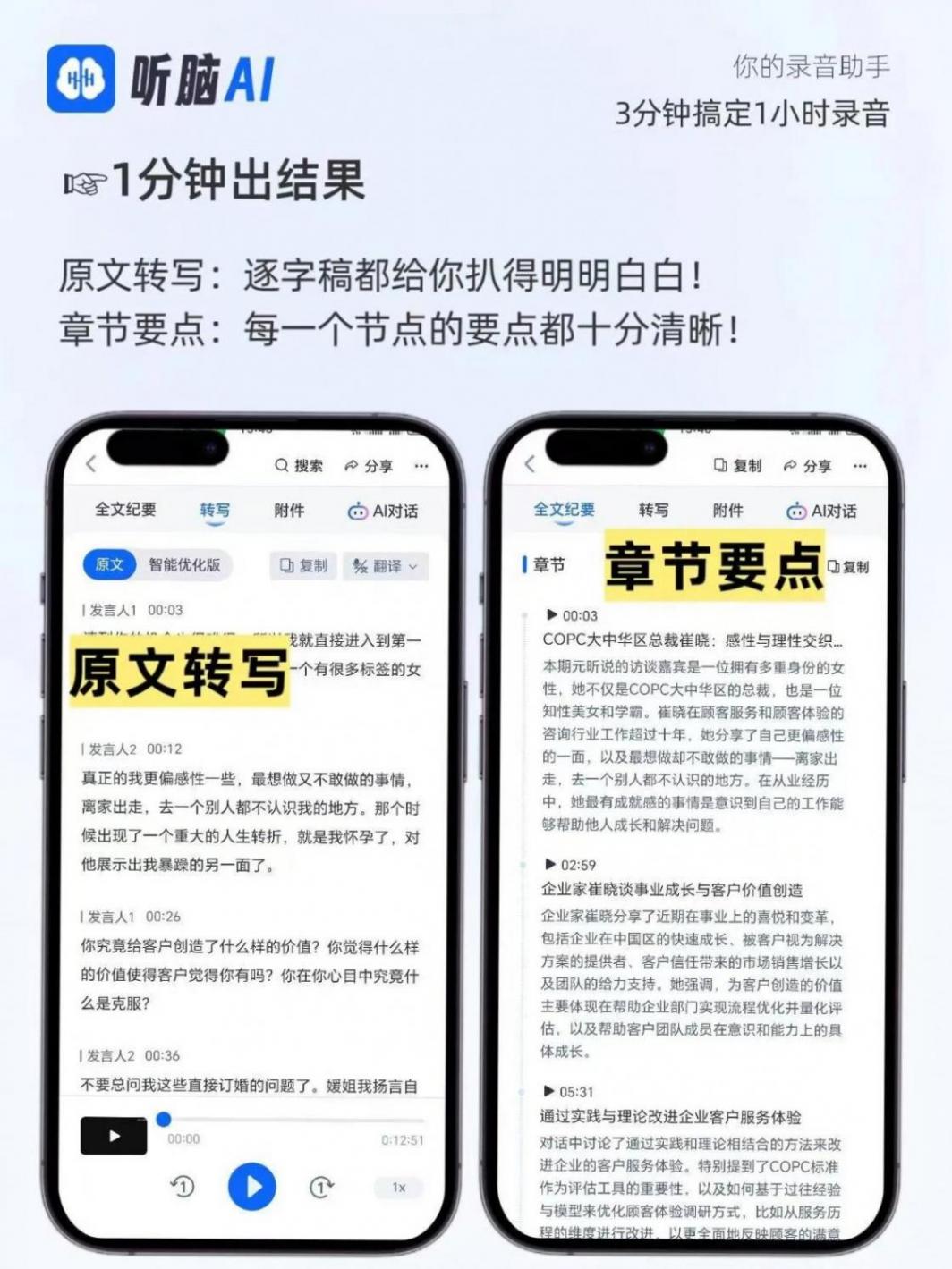 核心差別在哪?傳統工具是""被動執行"",你讓它轉文字,它就只轉文字;大模型驅動的聽腦AI是""主動理解"",它知道你錄這段音是要干嘛,然后幫你把事辦到位。