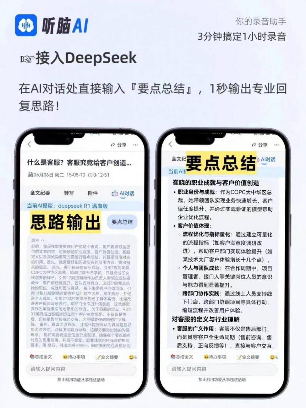 舉個例子:以前錄會議,你得自己決定""這段要標重點""""那個是待辦事項"";現在用聽腦AI,它會自動分析內容,判斷哪句是結論、哪句是待辦、誰負責什么事,直接幫你整理好。這就是""聰明""的地方——它懂你的需求。