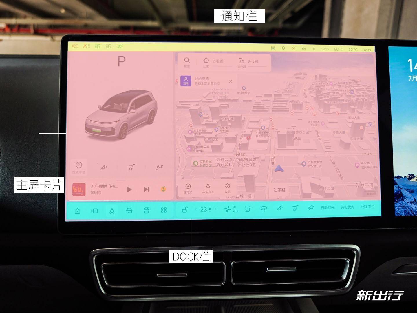 再來聊交互。其實(shí)在最近的幾個(gè)版本,L 系列的中控交互界面基本框架已經(jīng)定型了,主屏默認(rèn)狀態(tài)下由 70% 顯示面積的主屏交互卡片+30% 的通知欄/DOCK 欄組成。