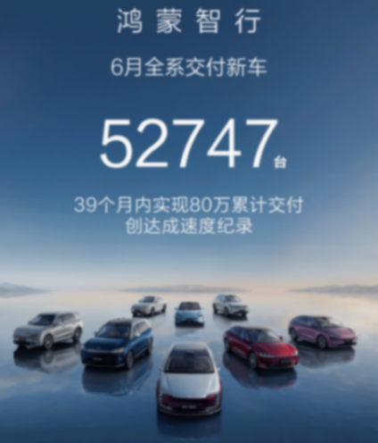 鴻蒙智行上半年累計銷量同樣超過20萬輛,在“四大家族”的共同支撐下維持高位運行。其中6月單月全系交付52747輛,創歷史新高,并成為新勢力月度銷量冠軍。