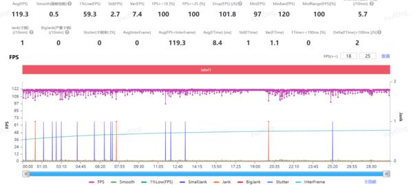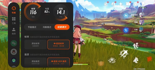 游戲?qū)崪y方面,依舊是筆者最愛的《原神》,游戲設(shè)置開到最高,同時打開電競模式,開啟超級幀率與超級HDR畫質(zhì),最終在室溫28度的房間里,半個小時的平均幀率為119.3 FPS,機(jī)身正面最高溫度為43.6℃,背面最高溫度為44.1℃。