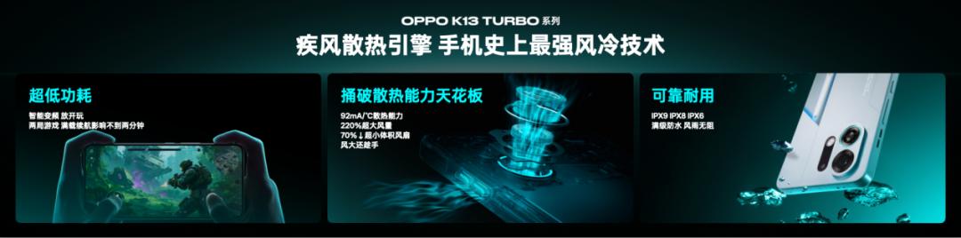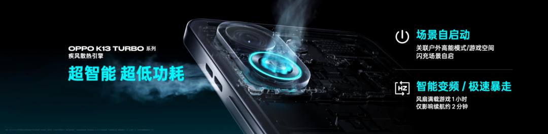 K13 Turbo系列搭載的OPPO自研疾風(fēng)散熱引擎,是傳統(tǒng)手機風(fēng)扇的風(fēng)量的220%,對比傳統(tǒng)手機的整機散熱能力提升20%。
