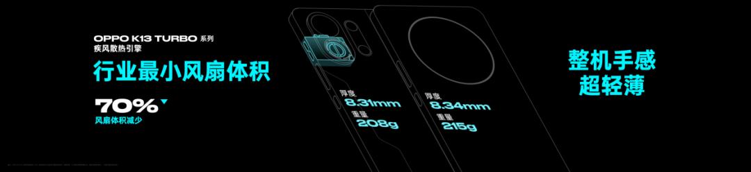為了解決內(nèi)置風(fēng)扇模組帶來的機身厚度問題,K13 Turbo系列延續(xù)OPPO在精工設(shè)計方面的技術(shù)優(yōu)勢,將疾風(fēng)散熱引擎模組高度集成,對比傳統(tǒng)方案體積縮小70%,釋放更多空間供其他模塊堆疊。