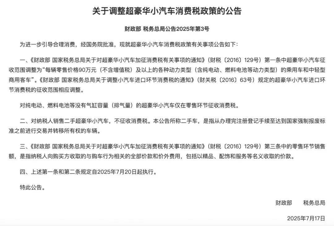 7月17日,財政部、國家稅務總局公告,7月20日起超豪華小汽車消費稅征收范圍調整將從每輛零售價格從130萬調整到90萬元,并將于7月20日起正式執行。