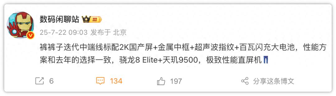 7月22日,數碼閑聊站發帖稱:“iQOO子迭代中端線標配2K國產屏+金屬中框+超聲波指紋+百瓦閃充大電池,性能方案和去年的選擇一致,驍龍8 Elite/天璣9500,極致性能直屏機。”