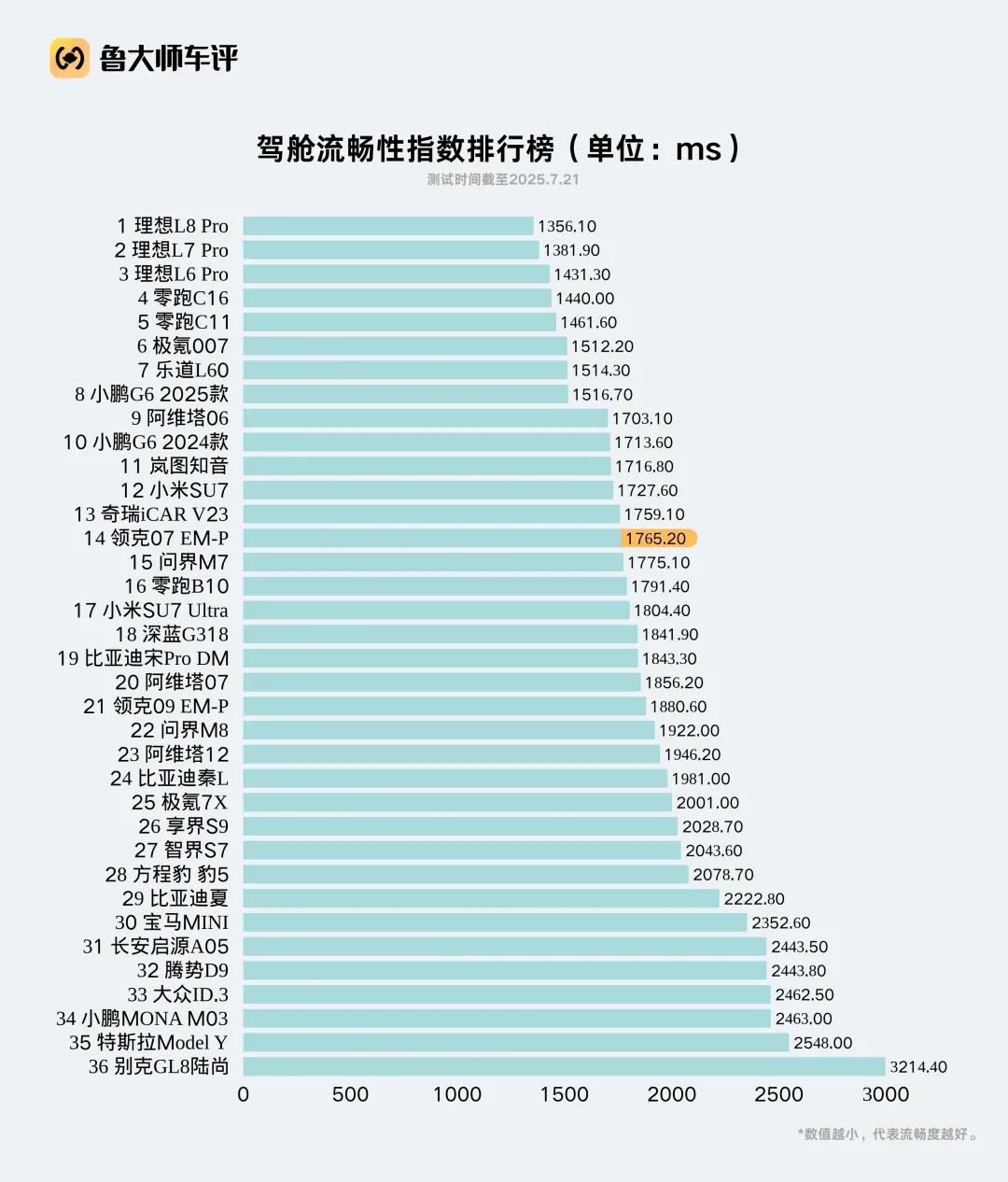 根據我們評測,領克07 EM-P的駕艙流暢指數為1765.2ms,在36款測試車型中排名第14,屬于中上游水準。