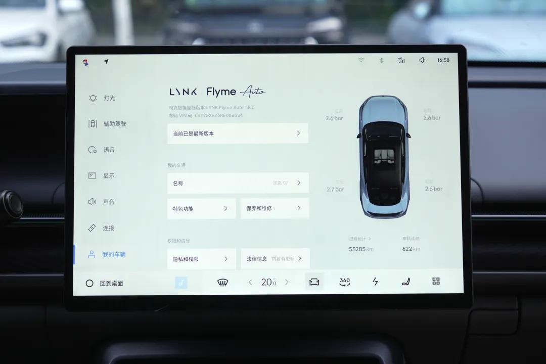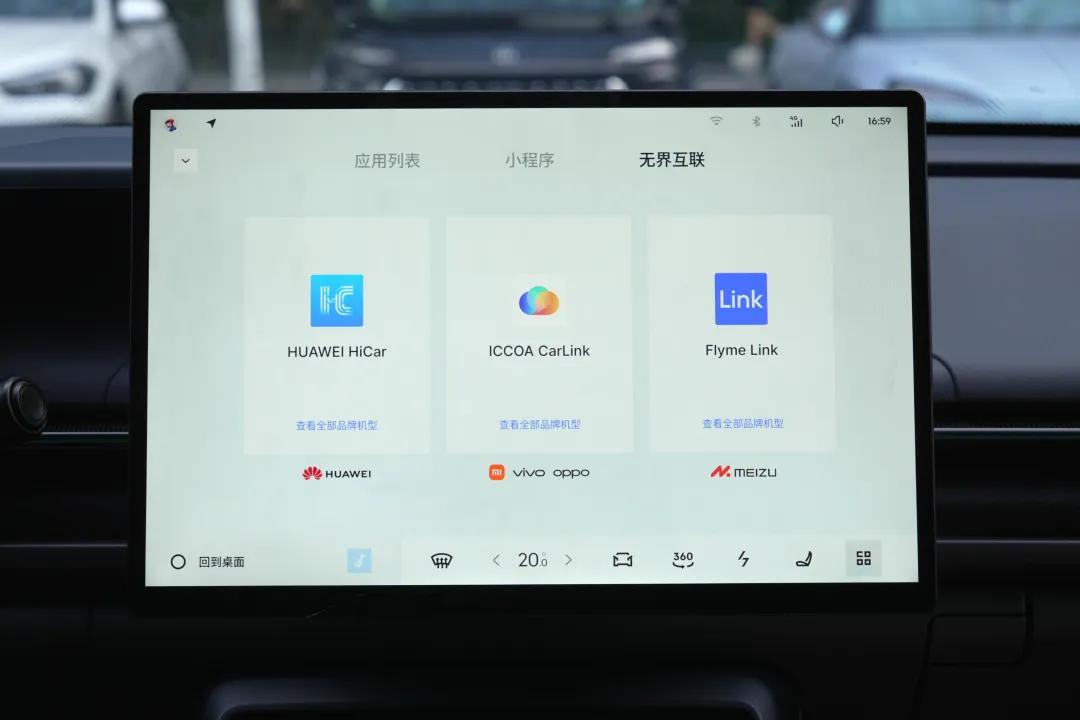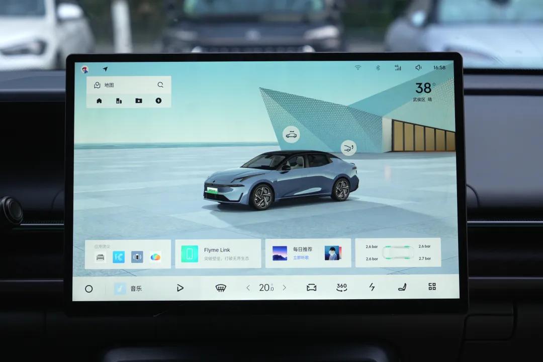 車機部分配備了一塊15.4英寸的2.5K中控大屏,搭載兩顆國產7nm“龍鷹一號”芯片,系統版本為LYNK Flyme Auto 1.8.0,支持HUAWEI HiCar、CarLink、Flyme Link等主流互聯協議。