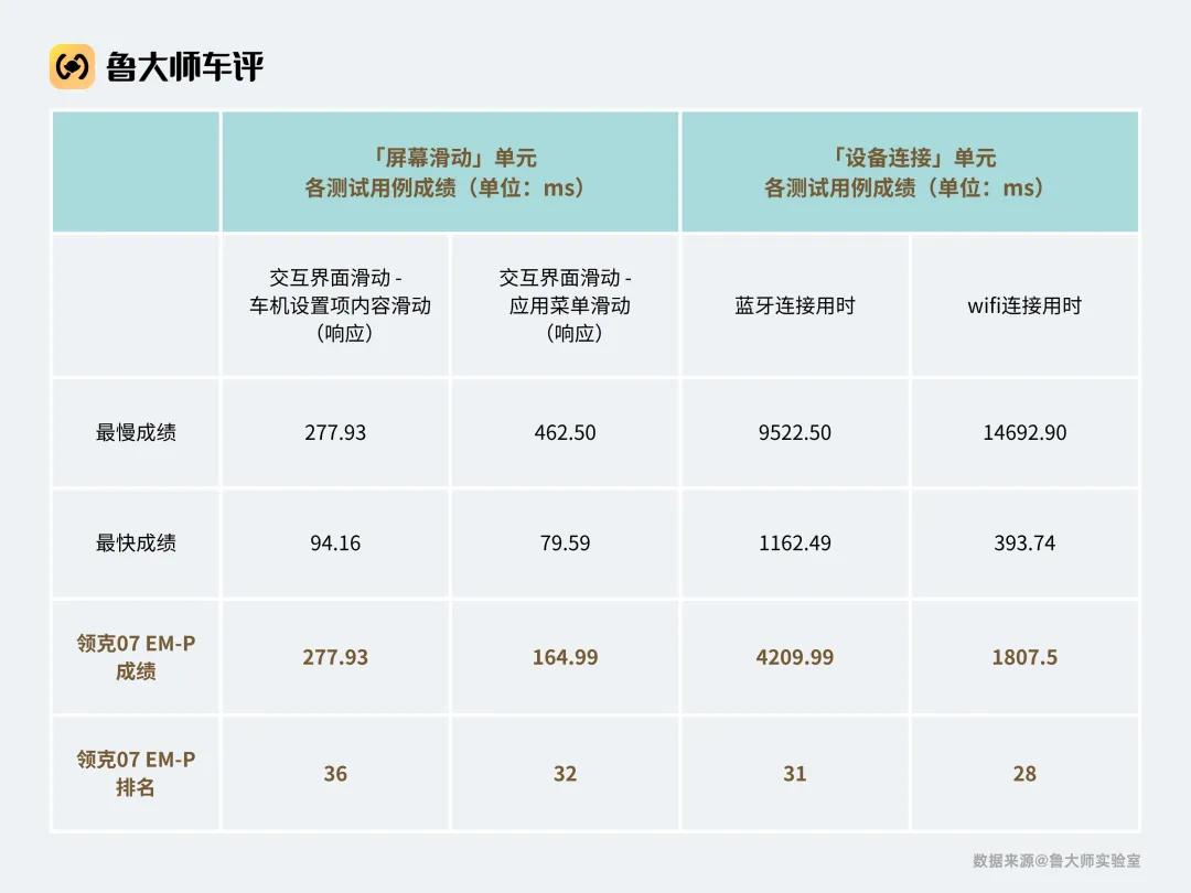 在車機設置界面滑動時,響應時延排名墊底,應用菜單滑動也僅排第32;