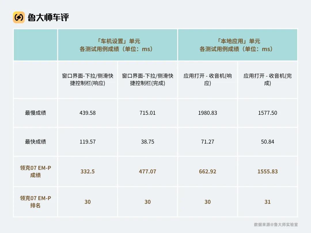 比如,下拉快捷控制欄時,車機的響應/完成時延排名第30;