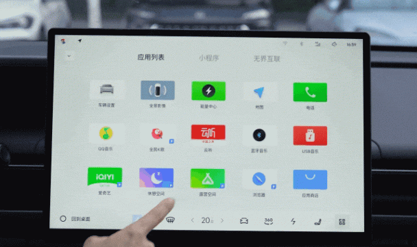 默認桌面為簡潔風格主頁,下拉快捷欄支持切換實況、地圖和壁紙桌面,同時整合了包括開關氛圍燈、打開后備箱、天窗遮陽簾等多個實用功能。
