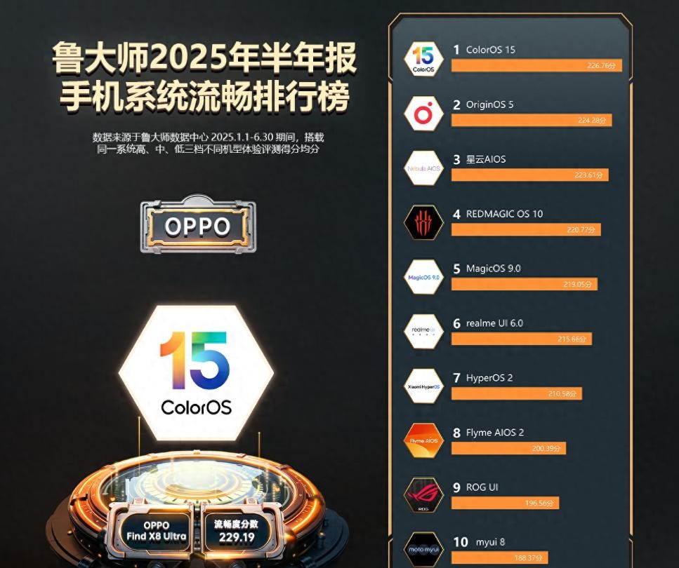 最近網(wǎng)上出了個手機系統(tǒng)流暢度榜單,魯大師測的,2025年上半年的安卓系統(tǒng)排名。第一名是OPPO的Color OS,第二vivo的Origin OS,第三居然是努比亞的星云OS,這確實有點意外。魅族Flyme這次第八名,以前它系統(tǒng)挺有名的,現(xiàn)在掉出去了挺可惜。