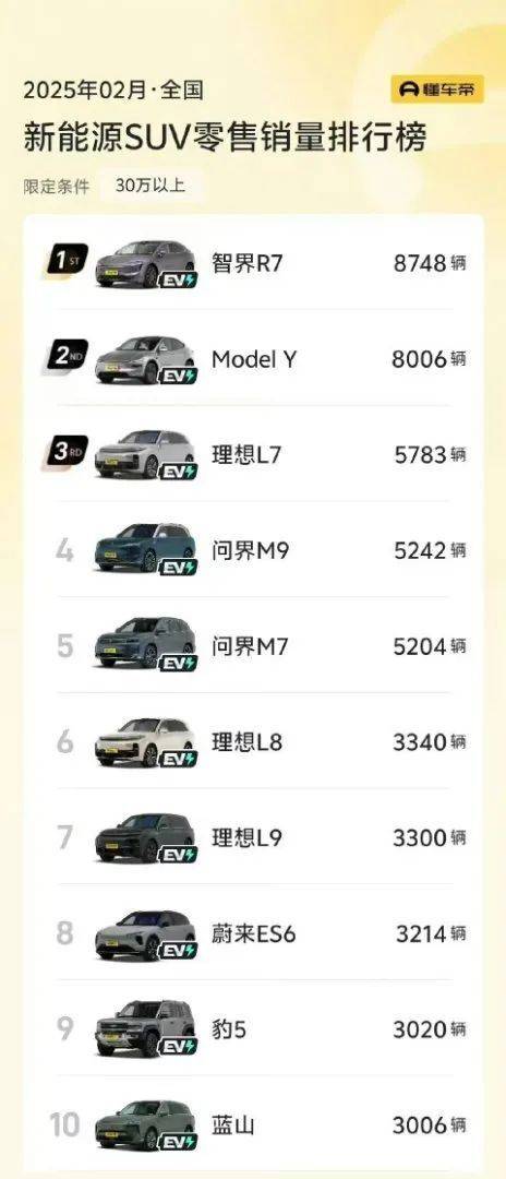 其實(shí)早在今年2月份,智界R7就在Model Y煥新前后反超過特斯拉的銷量,拿到了30萬以上新能源SUV的銷量冠軍;此前巔峰期的月交付量,也有1.5萬輛。