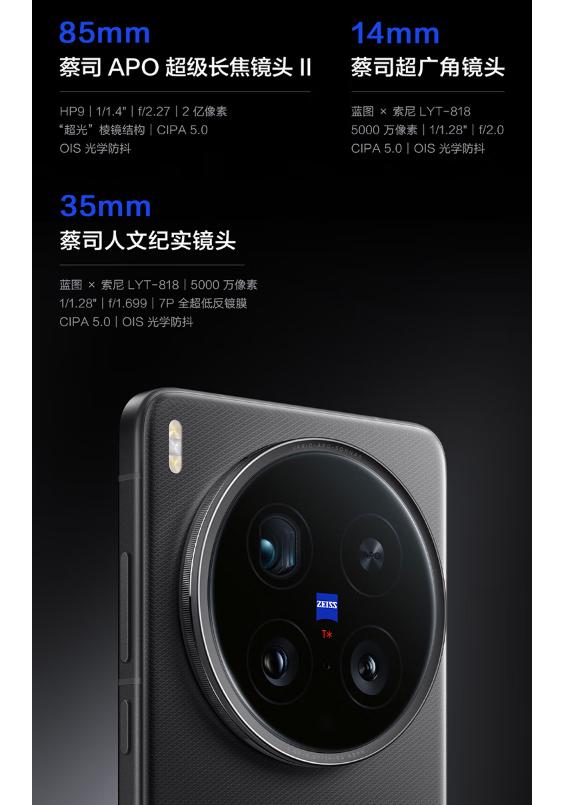 其有35mm主攝,索尼LYT-818,1/1.28英寸,7P鍍膜鏡組。超廣角也是LYT-818,支持14-35mm焦段裁切變焦。還有85mm長焦,1/1.4英寸,支持裁切的135mm長焦。