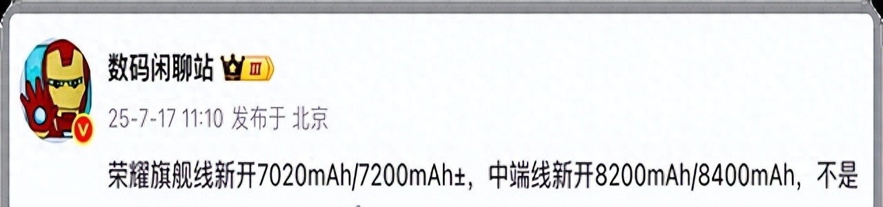 7月17日數碼博主爆料,榮耀中端機電池直奔8400mAh,旗艦機Magic8 Pro塞進7200mAh青海湖電池,這波操作直接把同行逼到墻角。