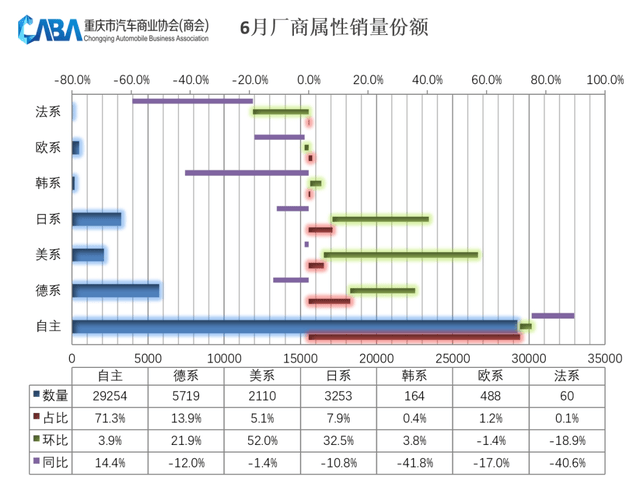 從廠商屬性來看,中國品牌6月份銷量超2.9萬輛,同比增長14.4%,市場占比達71.3%;德系品牌銷量超0.57萬輛,同比下滑12%,占比達13.9%;美系品牌銷量超0.21萬輛,同比下滑1.4%,占比達5.1%;日系品牌銷量超0.32萬輛,同比下滑10.8%,占比達7.9%。另外,韓系、歐系、法系銷量占比為1.7%,下滑比較明顯。其中,法系車銷量僅為60輛,同比下滑40.6%,市場前景堪憂。
