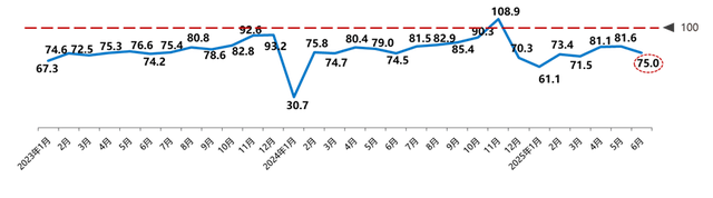 數據顯示:6月汽車消費指數為75.0,較上月有一定幅度的下降,預計7月份市場銷量有所回落;6月入店分指數為72.0,較上月有所下降。