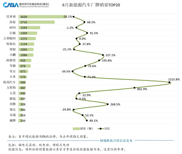 6月份,在重慶新能源汽車廠牌銷量TOP20中的前二排名為比亞迪、深藍,銷量分別為3630輛、2716輛。而AITO則取代了上月排名第三的啟源,其銷量為1593輛。