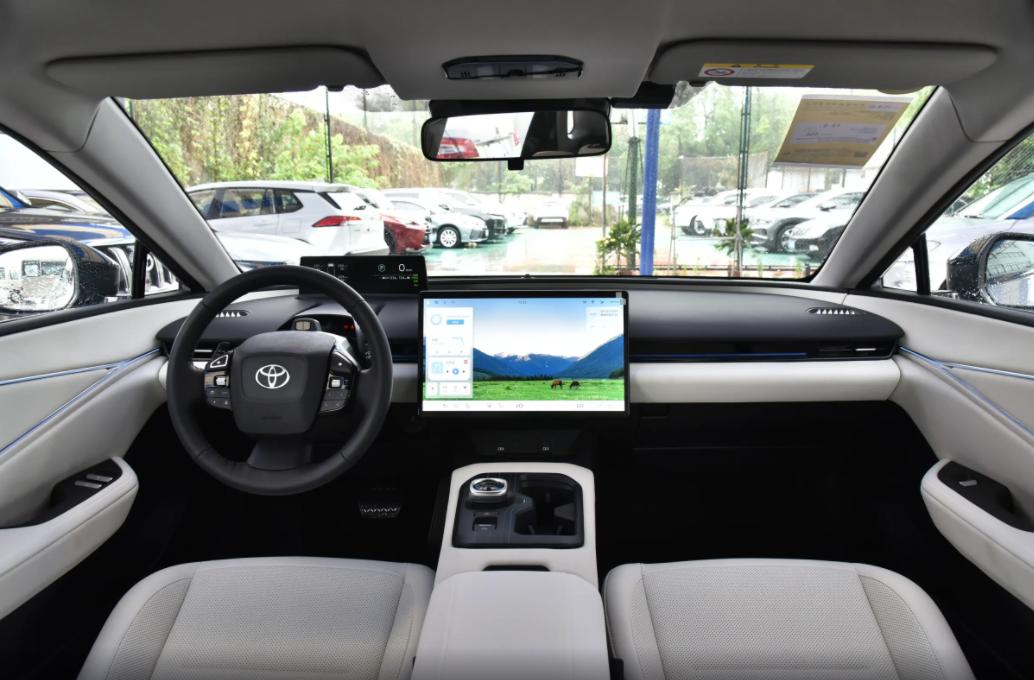 坐進車內,豐田bZ5的儀表臺布局也符合當下新能源市場的設計潮流,而且該車將儀表盤集成在距離前擋玻璃很近的區域,也算是代替HUD抬頭顯示的一種設計思路,同時也能避免駕駛者在行車過程中低頭看儀表信息的情況。不過需要注意的是,畢竟是豐田“bZ”系列,所以豐田bZ5還是保留了一些比較新穎的設計,例如左右轉向燈依然是按鍵式,分別集成在方向盤多功能按鍵的左右兩側。此外,在都以電子懷擋為主的當下,豐田bZ5依然堅持旋鈕式換擋調節,對比豐田鉑智3X稍顯遜色。