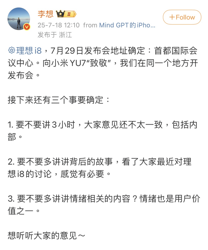 李想本人近期也通過微博征集發布會的方式以及地點,引發發起話題討論,保持線上和線下話題的持續預熱以及發酵,不斷拉高用戶的好奇。
