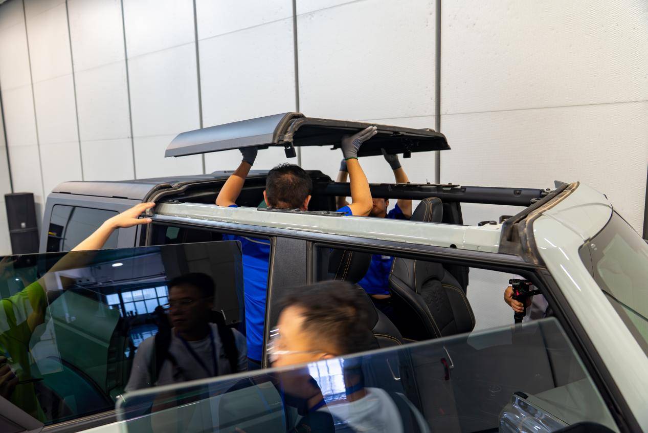 安全性能的考量同樣貫穿始終。自帶的防滾架采用領先的 HMGF+Q 熱氣脹成形技術,在高溫高壓下精準塑形,兼顧結構強度與輕量化。搭配全車 72% 高強鋼車身與安全氣簾,讓 “可拆” 與 “安全” 不再矛盾。四門兩蓋的鋁合金沖壓件經特殊工藝處理,在劇烈越野中也能保障結構完整性,北美進口的 a951 膠水發揮關鍵作用,其超強剪切性能確保鋁合金部件在極限工況下連接穩固。
