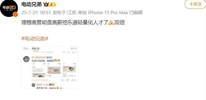 7月21日,有汽車博主表示,理想高管雙倍高薪挖樂道汽車(蔚來旗下子品牌)輕量化人才。