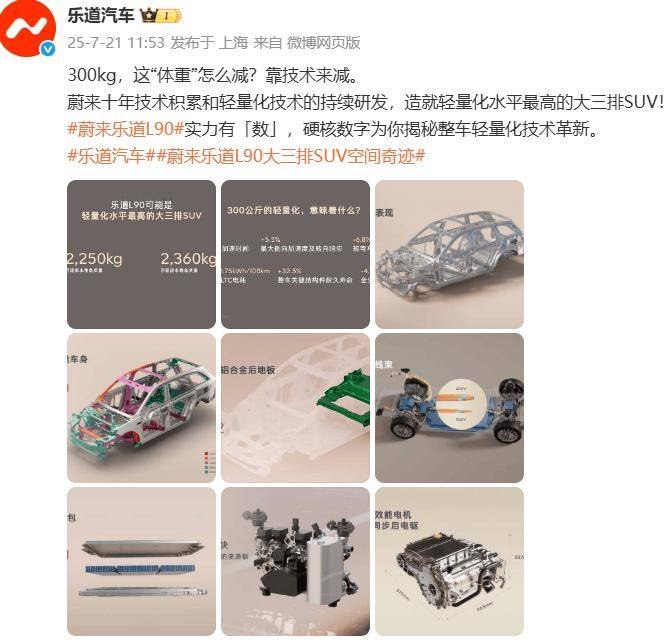 7月21日,樂道汽車發布了一篇題為《300kg,這“體重”怎么減?》的文章,詳細解讀了其輕量化技術。文章提到,樂道L90的車身輕量化系數為2.12,白車身的重量僅為433.8kg,相比同級別的增程車型優化了約20%。此外,文章還介紹了全新一代輕量化電池包,容量為85kWh,總重量僅為440kg,能量密度達到193.2Wh/kg,領先行業平均水平26%。文章還涉及了更多關于輕量化技術的解讀,并特別強調了“既懂輕量化,也懂增重”,列學了大量L90的配置細節。