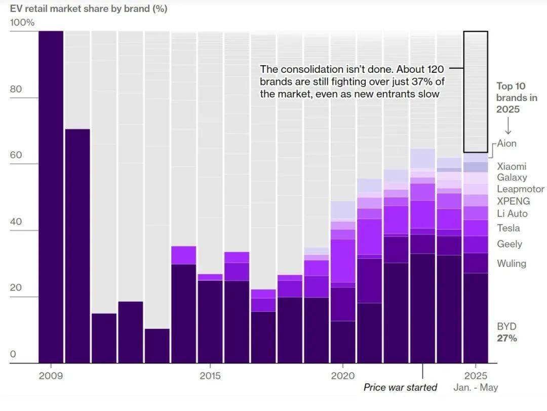 馬太效應(yīng)使得中國汽車公司的表現(xiàn)兩極分化,強(qiáng)者恒強(qiáng),弱者淘汰。截至今年5月,比亞迪占據(jù)中國電動汽車零售市場約27%的份額,但仍有大約120個其他品牌在爭奪37%的市場份額。