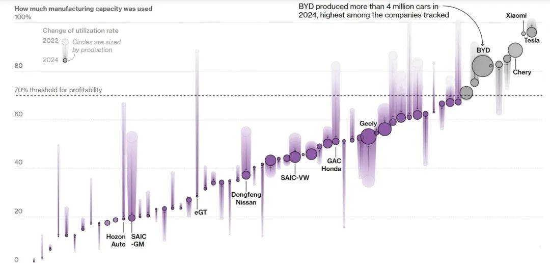 根據(jù)機(jī)構(gòu)統(tǒng)計(jì),在2024年國內(nèi)70家活躍的汽車制造商中,只有15%左右的工廠達(dá)到70%產(chǎn)能利用率的盈利最低可行標(biāo)準(zhǔn)。