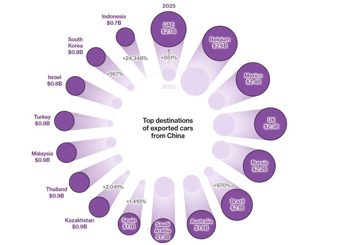 近期的貿(mào)易數(shù)據(jù)生動地說明了這種出口激增的程度。2025年前五個月,中國汽車出口達(dá)到新高峰,出口總額較2022年幾乎增長了兩倍,達(dá)到373億美元;僅對阿拉伯聯(lián)合酋長國的出口額就達(dá)到27億美元,較2022 年增長551%,凸顯了中東對中國汽車不斷增長的需求。