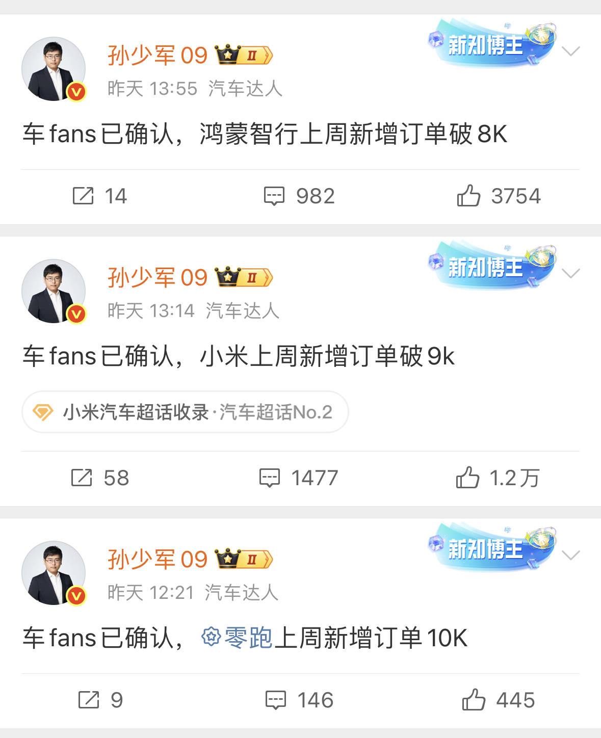 相比于第二周的排名,第三周自主新勢力第三強已經換人,小米憑借0.72萬輛的成績超過了理想。據上述博主統計,即便在訂單已經排到明年的情況下,小米汽車上周依舊新增超9000臺訂單。
