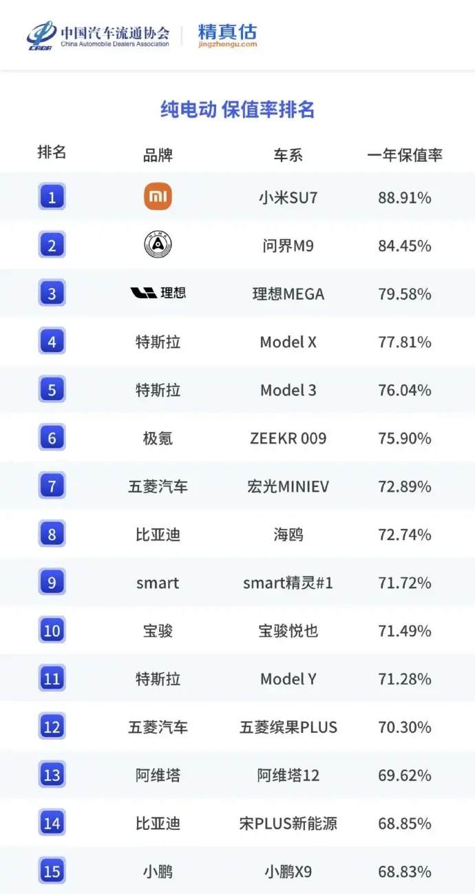 7月21日,小米副總裁李肖爽微博發(fā)文,援引中國(guó)汽車流通協(xié)會(huì)和精真估聯(lián)合發(fā)布的《2025上半年中國(guó)汽車保值率研究報(bào)告》數(shù)據(jù),宣布小米SU7一年保值率為88.91%,在所有純電車型中排名第一。