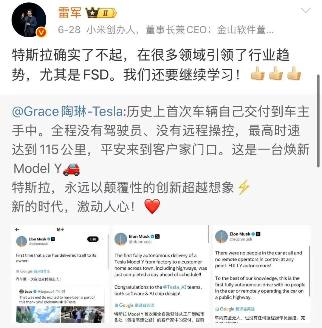 上個(gè)月底,雷軍轉(zhuǎn)載了特斯拉副總裁陶琳的微博,夸贊特斯拉在很多領(lǐng)域引領(lǐng)力行業(yè)趨勢(shì),“特斯拉確實(shí)了不起,在很多領(lǐng)域引領(lǐng)了行業(yè)趨勢(shì),尤其是FSD。我們還要繼續(xù)學(xué)習(xí)”。