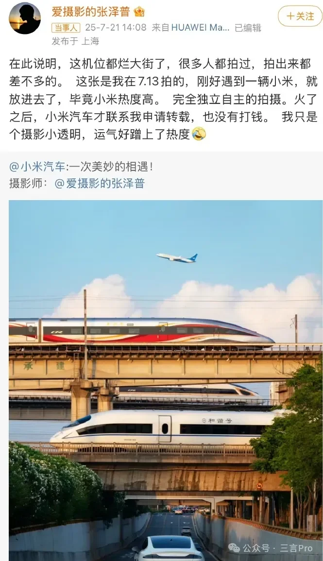 對(duì)此,照片拍攝者本人回應(yīng)稱:在此說(shuō)明,這機(jī)位都爛大街了,很多人都拍過(guò),拍出來(lái)都差不多的。 這張是我在7.13拍的,剛好遇到一輛小米,就放進(jìn)去了,畢竟小米熱度高。 完全獨(dú)立自主的拍攝?;鹆酥?,小米汽車才聯(lián)系我申請(qǐng)轉(zhuǎn)載,也沒(méi)有打錢。