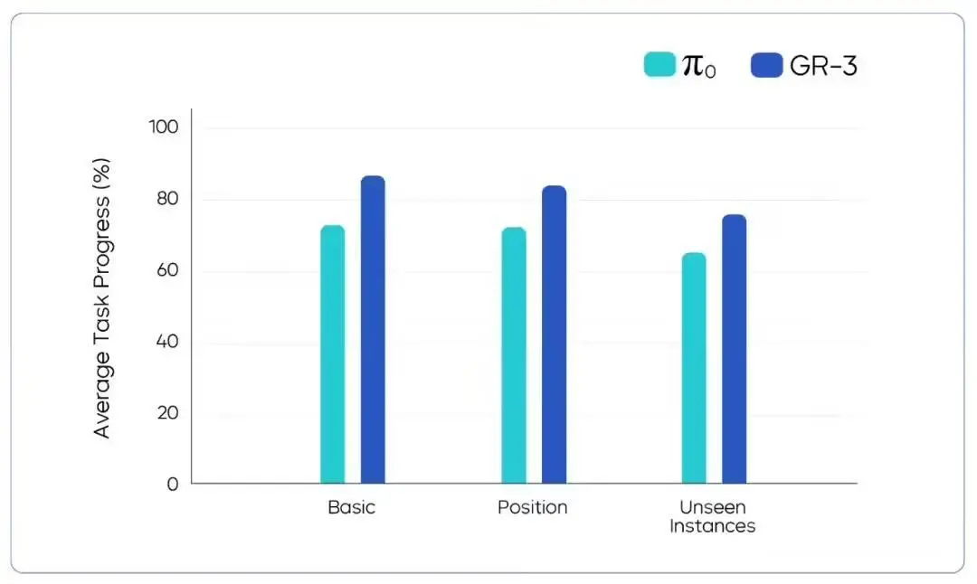 經過團隊上千次系統性實驗測試,GR-3 表現超過業界此前可測試具體性能的 VLA 頭部模型 π0。未來,團隊希望 GR-3 可以成為邁向通用機器人“大腦”的重要一步。