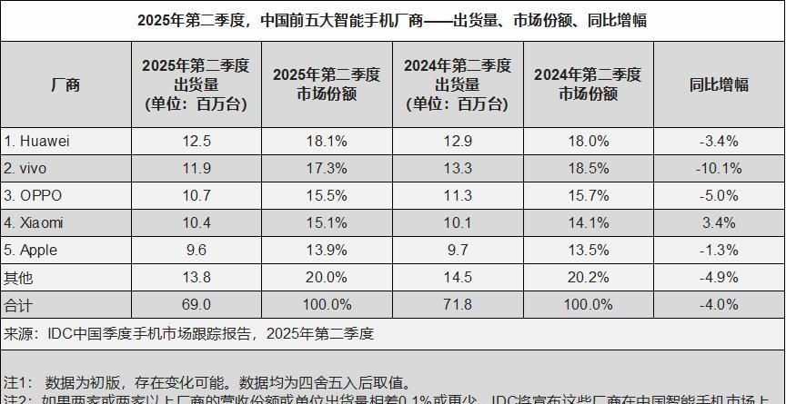 這份報(bào)告還顯示,整個(gè)中國(guó)智能手機(jī)市場(chǎng)今年上半年出貨量1.4億臺(tái),和去年同期差不多。雖然華為拿了第一,但手機(jī)銷量其實(shí)比去年少3.4%。其他品牌里,vivo、OPPO、小米和蘋果緊隨其后,差距都不大。只有小米銷量增長(zhǎng)3.4%,是頭部品牌里唯一上漲的。