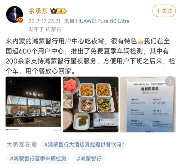 近日,華為常務董事、終端BG董事長、智能汽車解決方案BU董事長余承東親自發文,介紹了鴻蒙智行用戶中心推出的“星夜服務”。這項服務直擊都市人群痛點:延長營業時間至深夜,方便用戶下班后來店進行車輛檢測、保養或充電。而最讓用戶感到驚喜的是,這項服務并非簡單的“加班”,而是配套了免費的“宵夜”。許多體驗過的用戶在網上調侃:“’鴻蒙大酒店‘連宵夜都安排上了,這是要把‘回家吃飯’進行到底。”