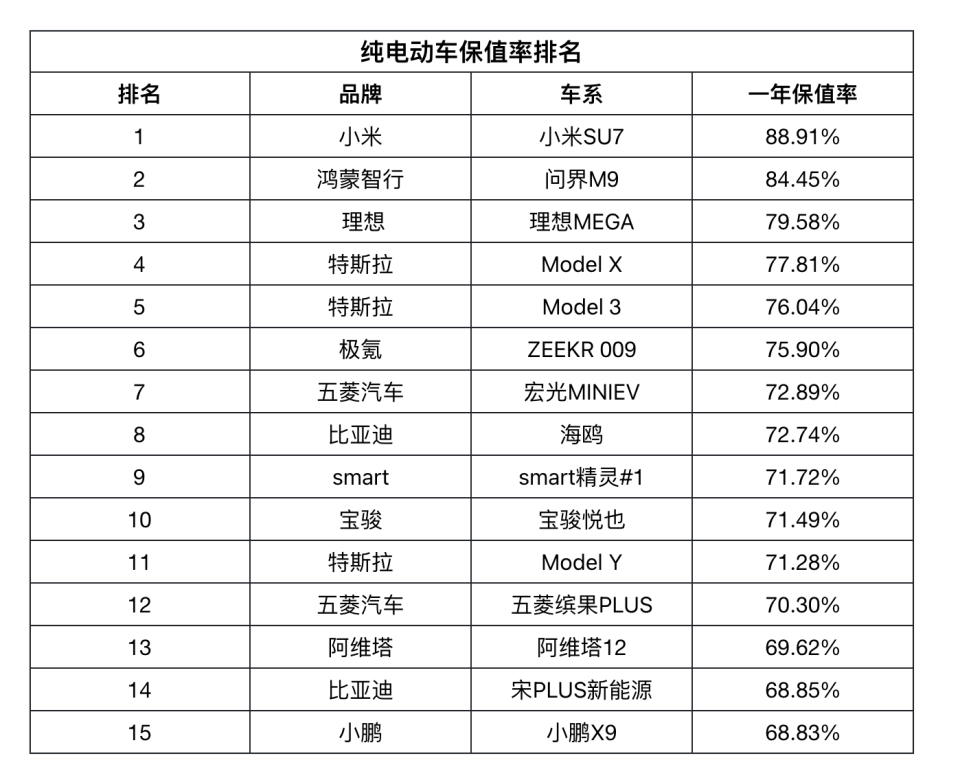 榜單顯示,頭部電動車型的保值表現遠超許多人的想象:小米SU7以近89%的驚人數據登頂,問界M9緊隨其后超過84%,就連一度引發爭議的理想也穩居前三(79.58%)。