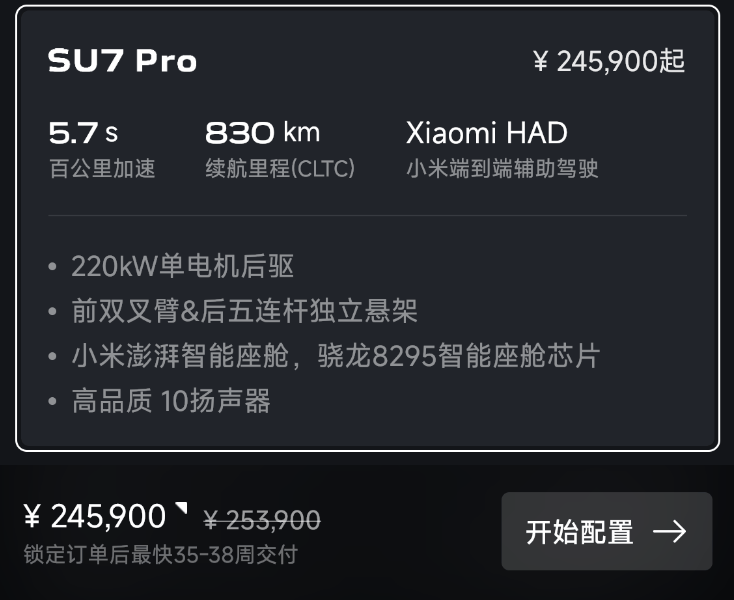 換言之,假如你現在買一臺小米SU7,一年以后再換車,你僅需虧車價的10%而已。這保值率放在電動車上堪稱逆天,也讓那些普遍一年虧掉車價50%的純電動車無地自容。當然了,你得知道哪怕現在下訂一臺SU7,你最快也得等到33周以后,車子才會交付到你手上。