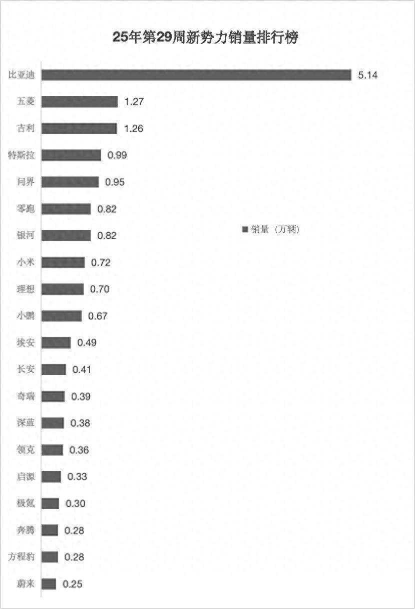 1、Top3沒有變化,比亞迪以5.14萬輛的單周銷量成為毫無懸念的第一,環比有所回升,但相比6月單周約8萬輛的高位水平,仍存在較大差距。五菱與吉利分列榜單第二、第三,單周銷量分別為1.27萬輛和1.26萬輛,兩家差別不大,不過吉利還有銀河的0.82萬輛,算上這部分的話吉利整體單周也超過2萬輛,只是銀河沒有守住此前單周破萬的成績。
